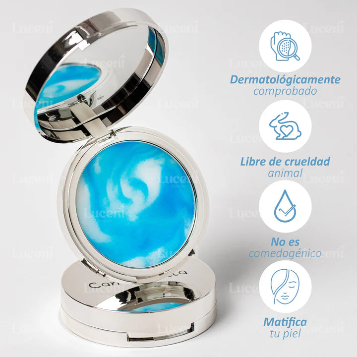 Aplicación del Polvo: Usa la borla para aplicar el polvo en seco o húmedo (opcional) sobre las zonas propensas a la oleosidad.